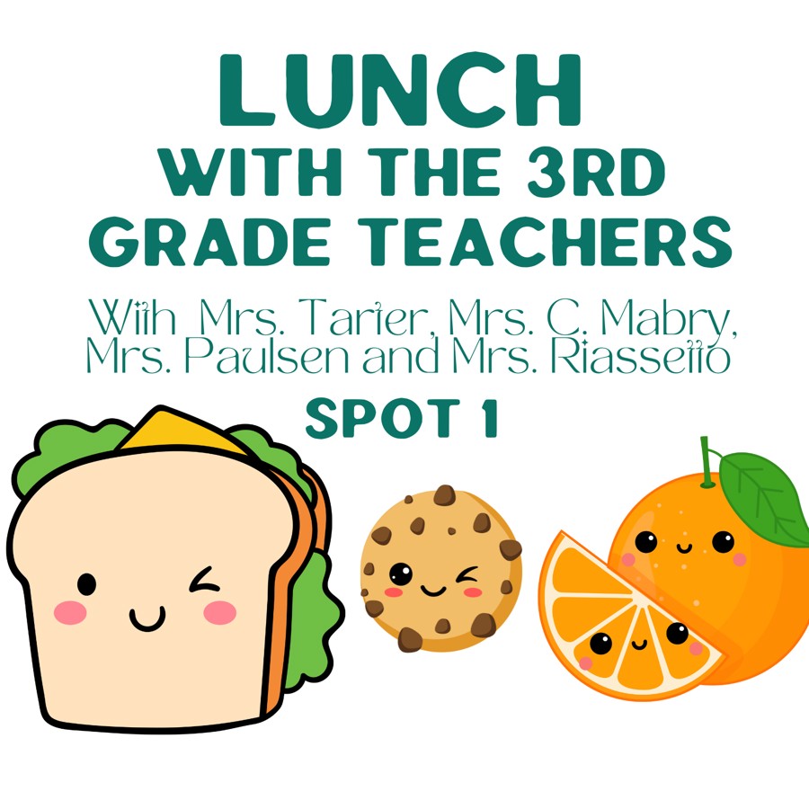 The winning bidder will join the 3rd Grade Teachers (Mrs. Tarter, Mrs. C. Mabry, Mrs. Riassetto and Mrs. Paulsen) for a special lunch! Lunch is provided, no need to bring one. This activity will take place on April 4, 2025 in Room 131. There are five (5) available spots for this activity, you are bidding on one of them.