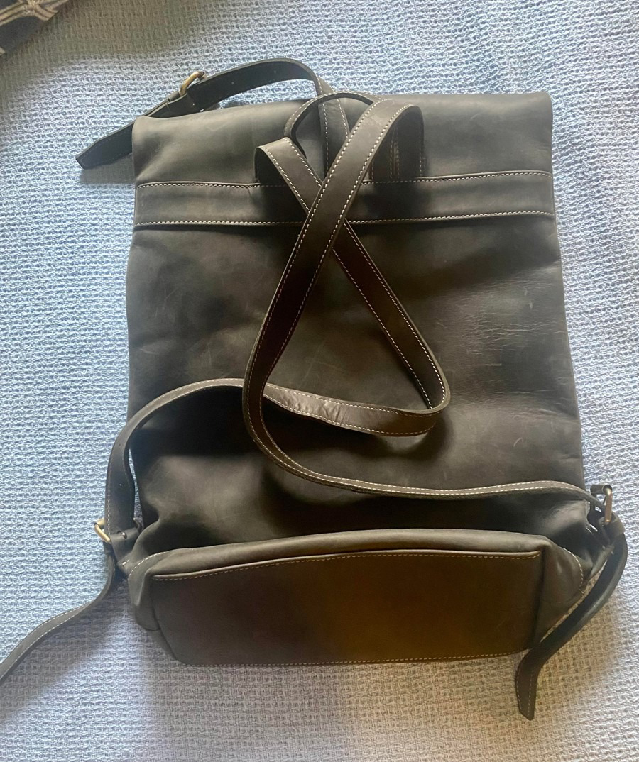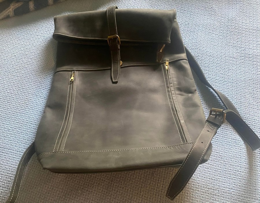 Luxurious Dark Pearl Gray Leather Backpack New has no tags but is new in pristine condition. There are two front zip pockets and another zip pocket in the interior. It has a top zip and adjustable straps. First quality.