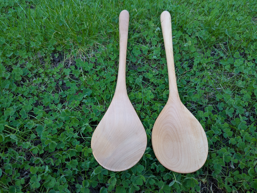 The spoons are also madrona, both exhibit lovely grain. These are very durable kitchen implements. They have a slight curve in the handle for reaching down into a serving bowl. The spoons are just under 13” long with the bowls being approximately 2 ½” wide by 3 ½” long