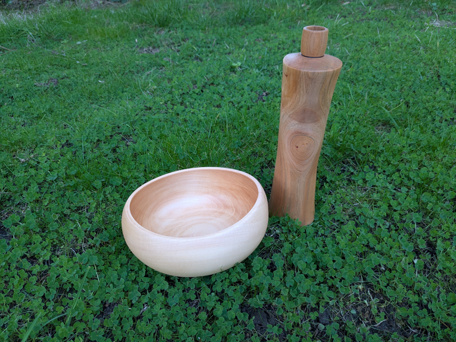 The vase is for dry use– show off sprigs of dry lavender rather than fresh flowers. There is a knot that goes through the vase presenting a mellow grain variation on one side and a more vibrant variation on the other. The vase is 12” tall with a diameter that varies up to 3” at the maximum. Both pieces are finished with walnut oil and completely food safe.