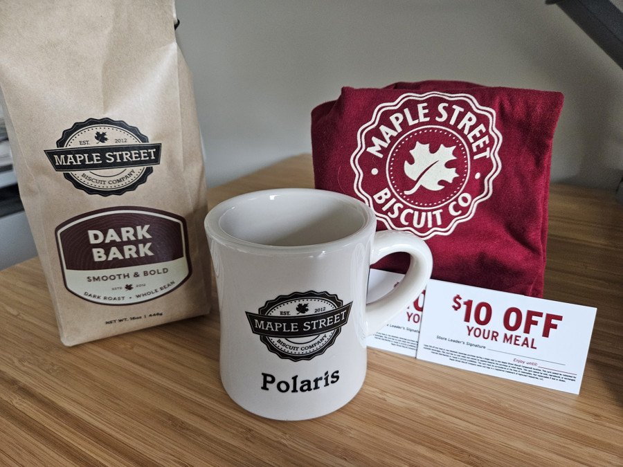 Maple Street Biscuit Company Gift Basket - 2x $10 Off Coupons, Mug, Coffee Beans, Shirt (L)
