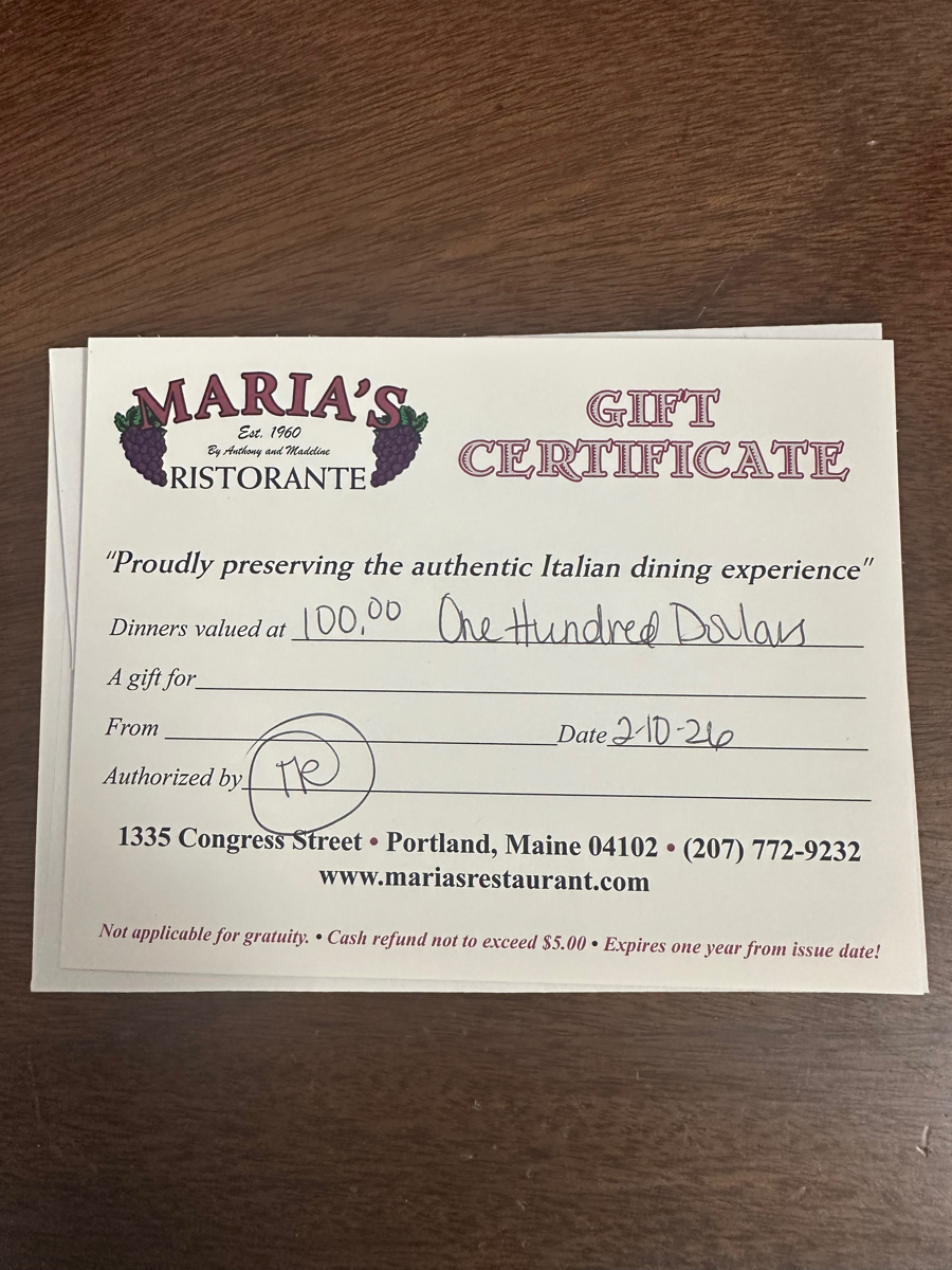 Experience the taste of Italy with a $100.00 gift certificate to Maria's Authentic Italian Restaurant in Portland. Delight in a culinary journey featuring traditional dishes crafted with the finest ingredients. Whether you're craving homemade pasta, fresh seafood, or delectable desserts, Maria's offers an unforgettable dining experience. Treat yourself or a loved one to a memorable meal at this beloved local gem. Don't miss the opportunity to savor authentic Italian cuisine at Maria's!