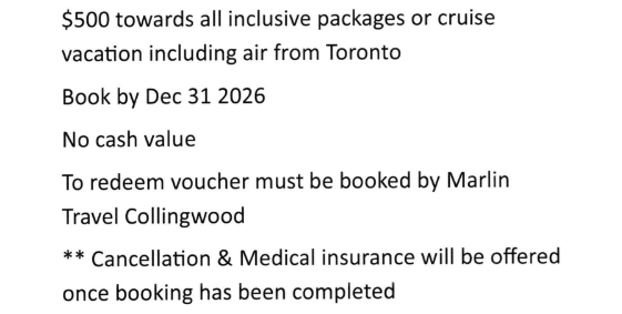 $500 towards all inclusive packages or cruise vacation including air from Toronto Book by Dec 31 2026 No cash value To redeem voucher must be booked by Marlin Travel Collingwood ** Cancellation & Medical insurance will be offered once booking has been completed Present Voucher brenda.chapman@marlintravel.ca