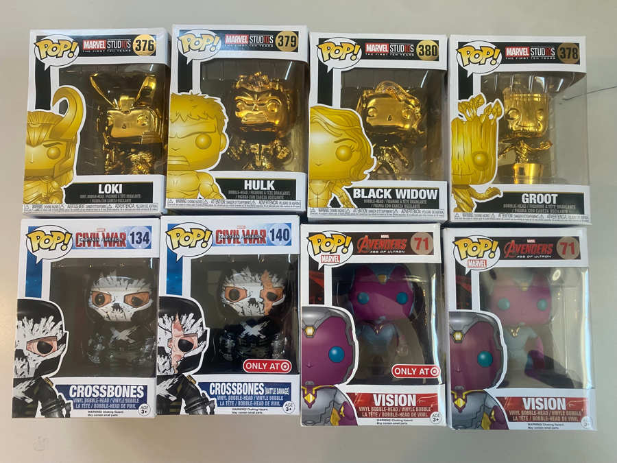 8 Marvel Pop Figures - A collectors dream/something cool for your kids. #376 Loki, #378 Groot, #379 Hulk, #380 Black Widow, #134 Crossbones (Captain America: Civil War), #140 Crossbones (Battle Damage/Civil War Variant), (2) #71 Vision (Avengers: Age of Ultron).