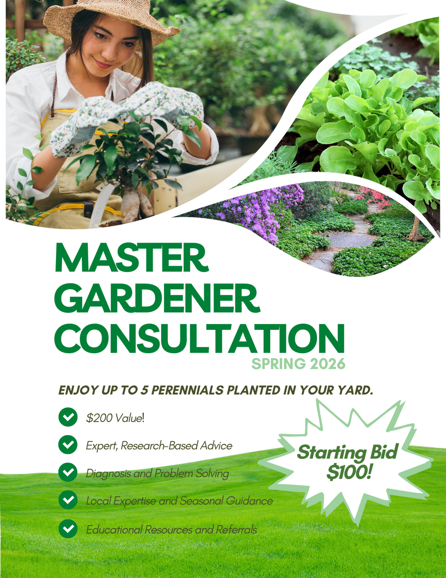 Enjoy a personalized consultation with a Master Gardener including: a spring consultation session, up to 5 perennials planted in your yard, expert, research-based advice, diagnosis and problem solving, local expertise and seasonal guidance, educational resources and referrals. From blooms to veggies, soil to sunlight — learn from the best and make your yard the envy of the neighborhood!
