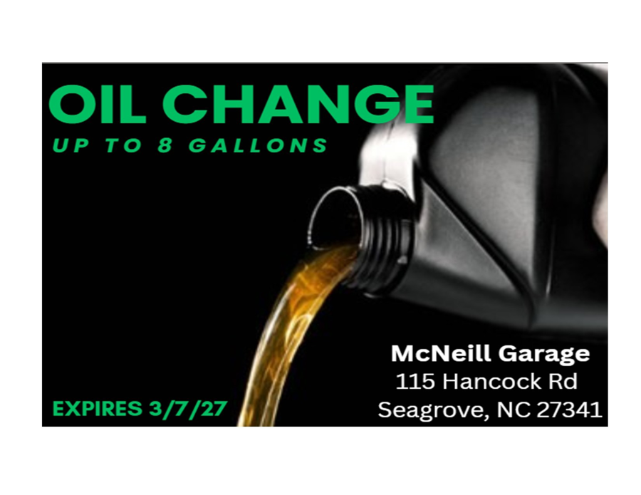 8qt or less oil change. Locally owned and operated McNeill Garage just south of Seagrove.