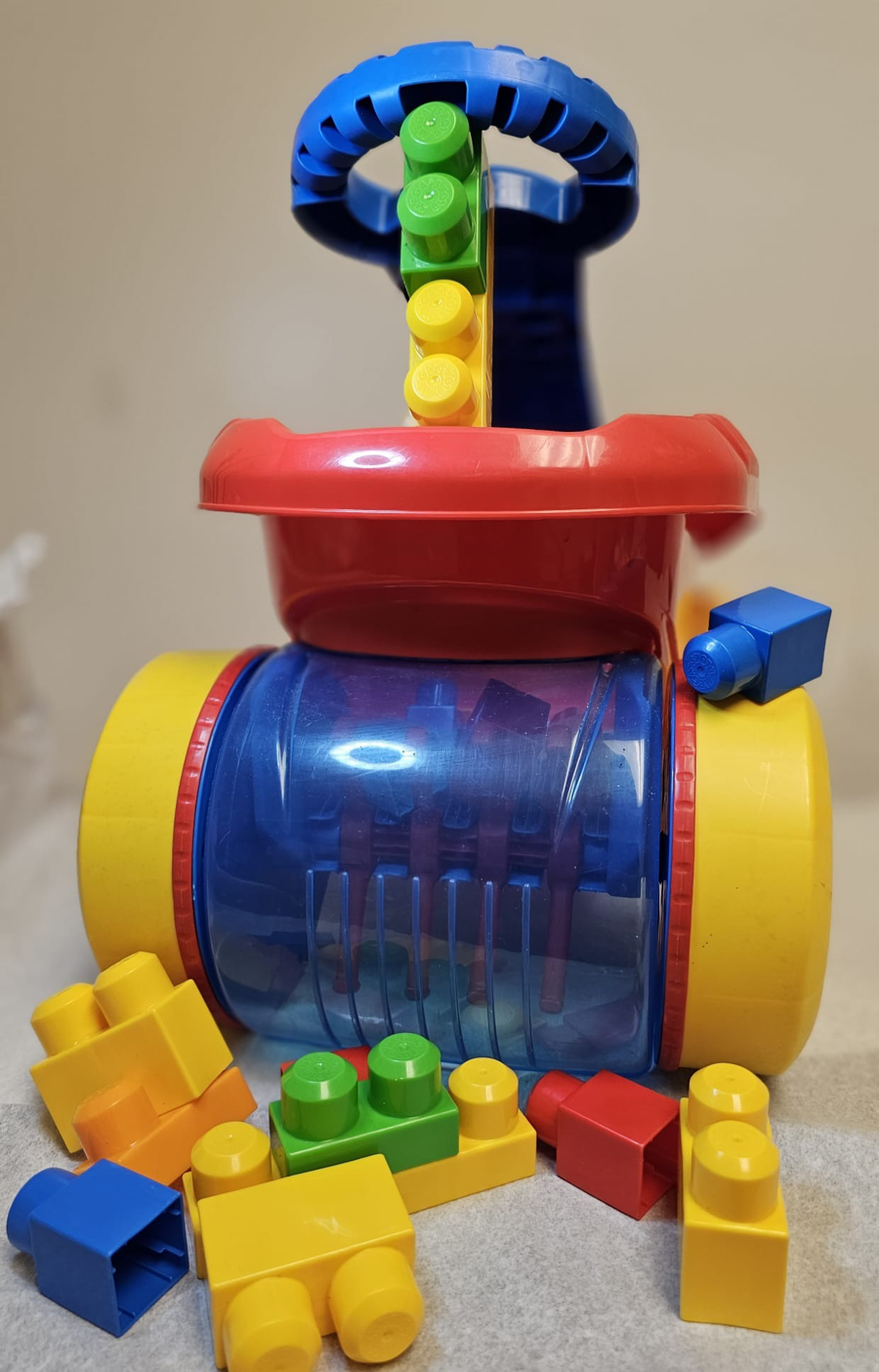This Mega Blok scooping wagon is super fun. Not only are the blocks easy to grip and pull apart, as the toddler learns to walk, the wagon can collect the blocks with its front loading mechanism. Comes with 21 blocks. Compatible with all first builder sets. A must have for under the Christmas tree! Color : Multicolor Condition: Like New Size: 30.5 x 45.7 x 32.6 centimeters