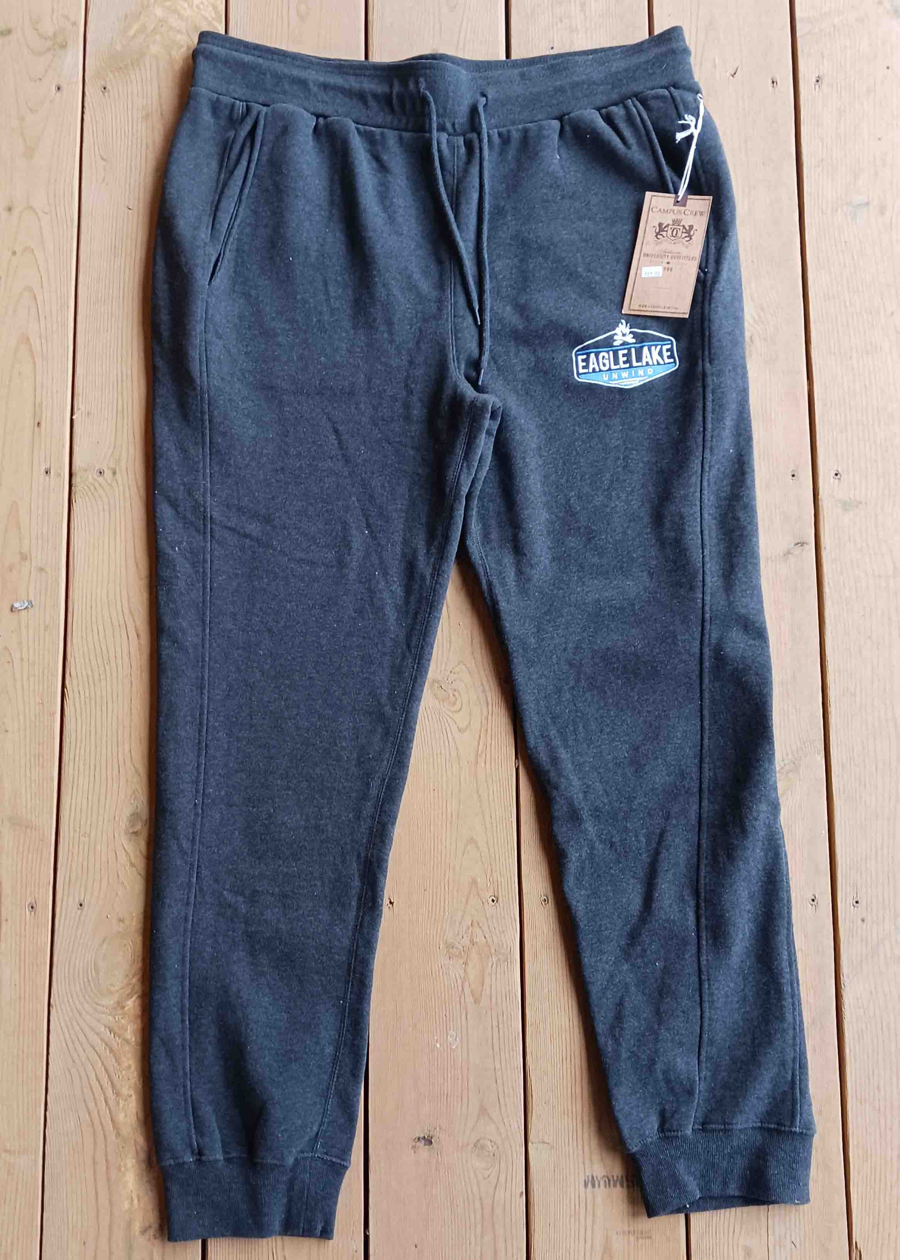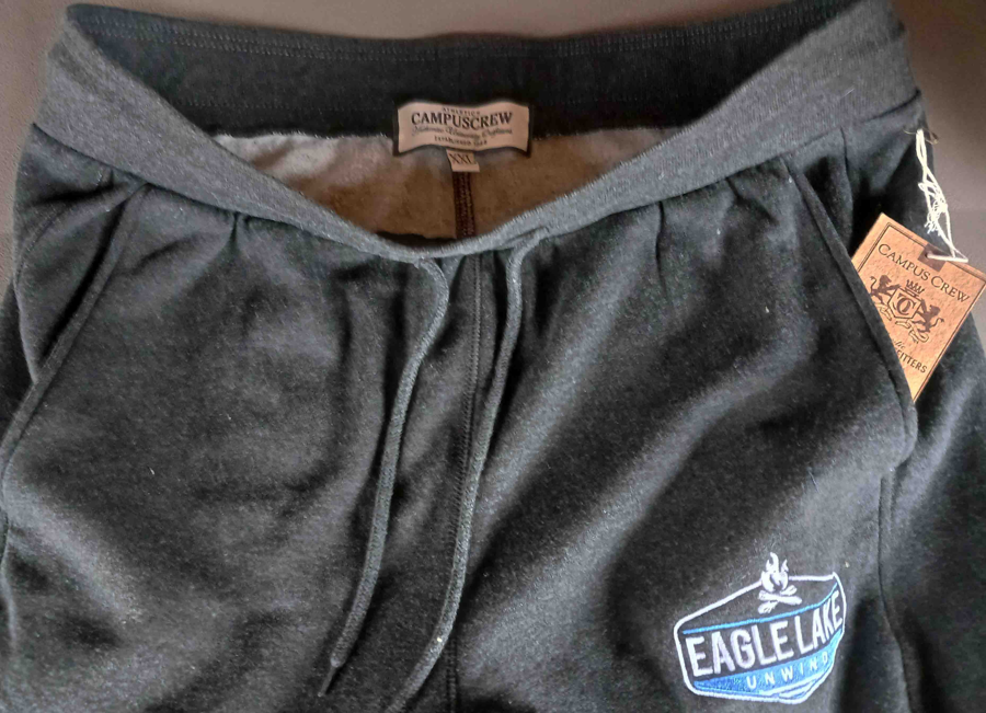 Excellent Campus Crew quality dark grey men's track pants in XXL. "Eagle Lake unwind" logo. Nicely styled with a generous band around the waist. Deep pockets.