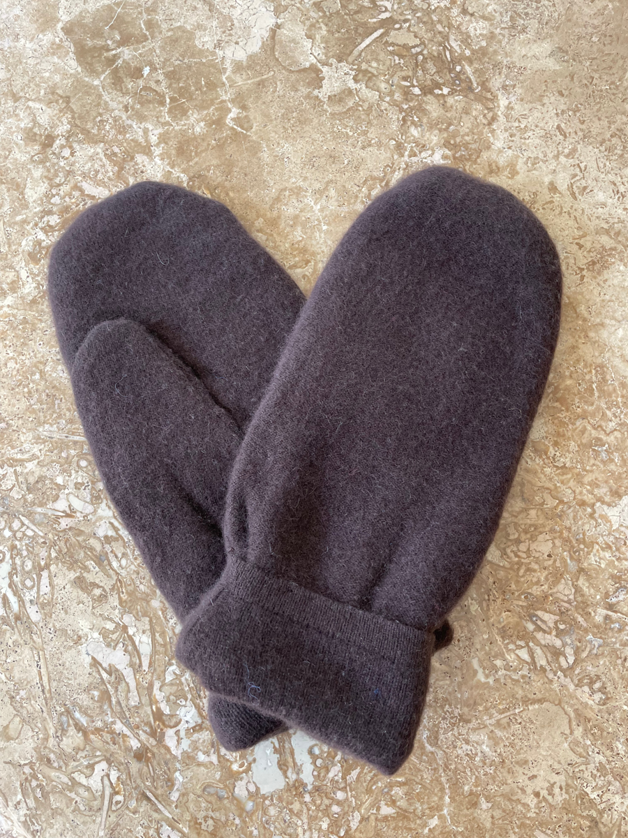 100% Cashmere Sweater Mitts made from recycled sweaters. Dark Brown Men's. Hand-made by local craftswoman Sharon McLaughlin. Your hands will thank you.