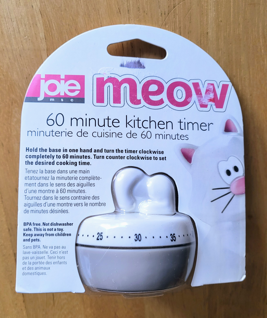 Cook everything to PURRfection with this Joie Meow Cat Themed 60-Minute Kitchen Timer. Adorable cat with mouse atop the timer. Measures about 3" in diameter x 3.5" tall, in original packaging.