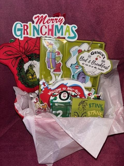 Grinchy Christmas Decorations straight from Whoville. Countdown to Christmas, Village set, various signs, and dish towel.