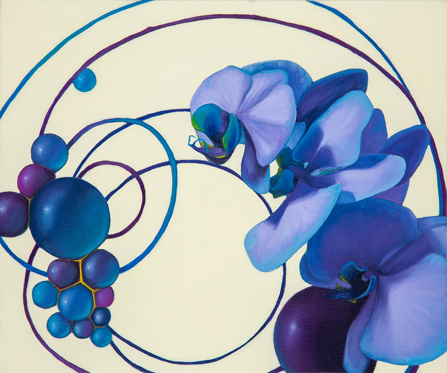 Mia Brownell, "Still Life with Garden Variety" Oil on canvas 10 x 12 inches Artist Bio: Mia Brownell is a New York and Connecticut based artist whose paintings use the conventions of traditional food still-life painting, simultaneously referencing 17th century Dutch realism and the coiling configurations of scientific molecular imaging. The culture, science, and environmental issues surrounding the global industrial food complex often inspire Brownell’s sci-fi still life paintings. Artist Statement: For quite some time, the natural world has not been entirely natural. Nutrients and energy along with industrial compounds and pollutants – including plastics – move from the ecosystem to our bodies. My paintings explore a vivid and complex world of biochemical relationships that tie us to the earth and to all that we add to it. I imagine the entanglement between the industrial production of food and the molecular strains that then interact with our bodies. This is a paradoxical perspective, one that is equally rational and fantastical, material and in constant flux. If we are what we eat, what are we becoming? My paintings embellish the conventions of the painted food still life to probe the lines between food, culture, and biology. I invite viewers to contemplate the interaction between their body and the natural world, between their physiology and all the ways in which we shape and are shaped by our environment.