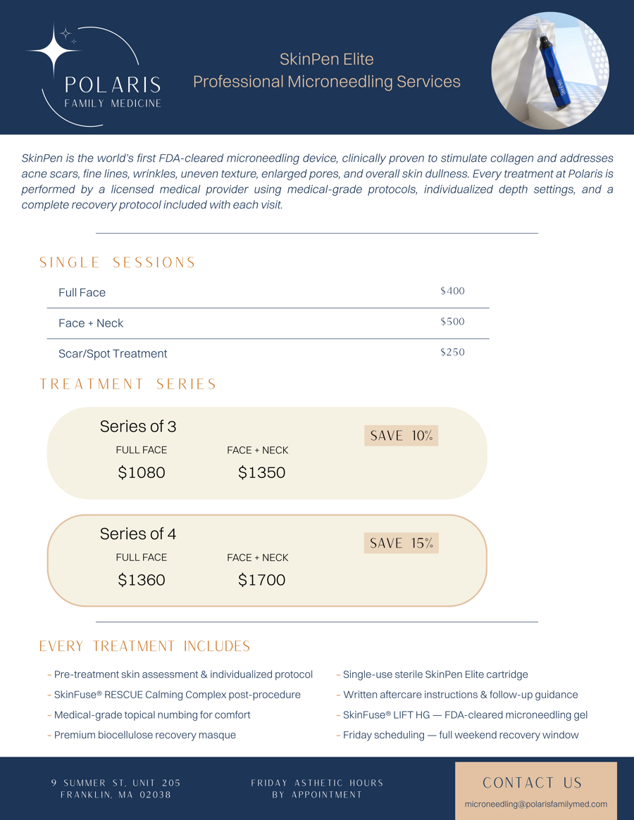Polaris Family Medicine is an independent medical practice located right in downtown Franklin, founded on the belief that great care is both evidence-based and personal. Microneedling services are performed by Leigh Dobbs, a board-certified family nurse practitioner with over 13 years of clinical experience, using the FDA-cleared SkinPen Elite — the gold standard in professional microneedling devices.