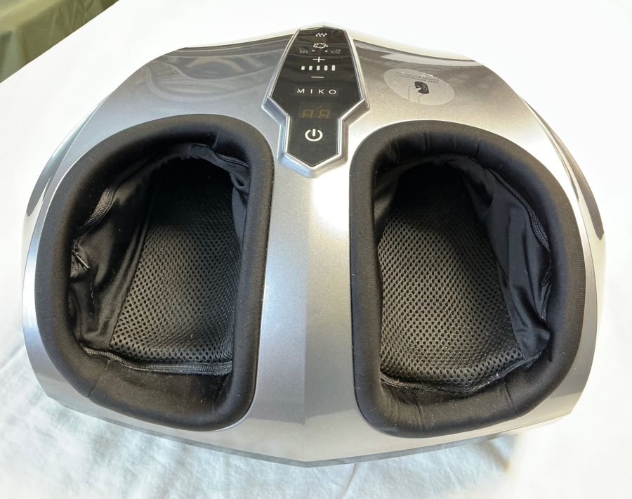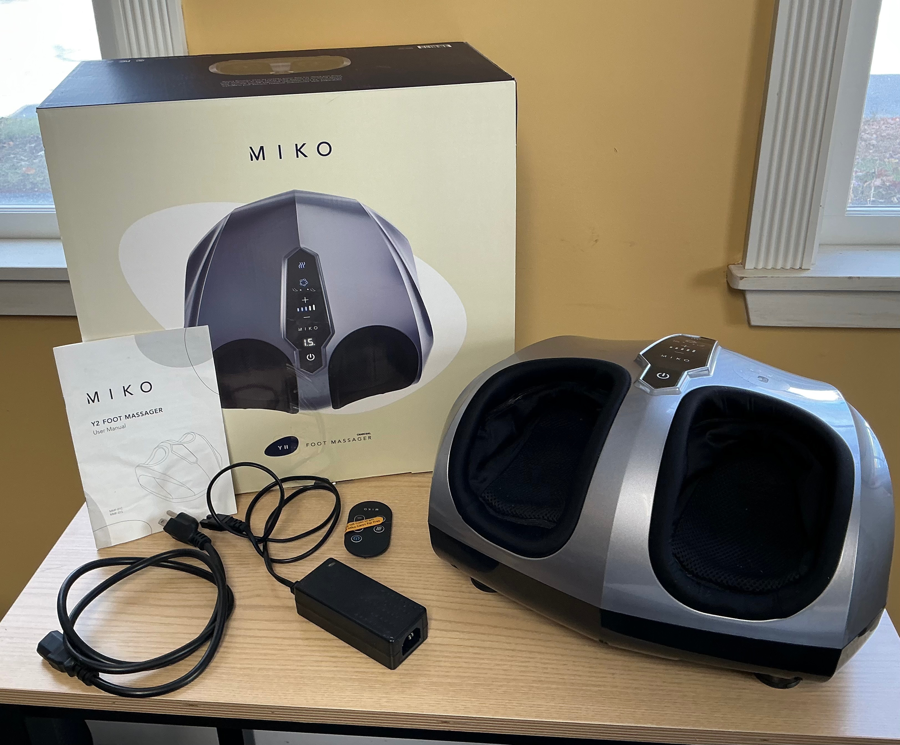 Miko Y2 Foot Massager. Features a petrissage style massage, air compression, and infrared heat. Includes a wireless remote, power supply connections, and the original manual.