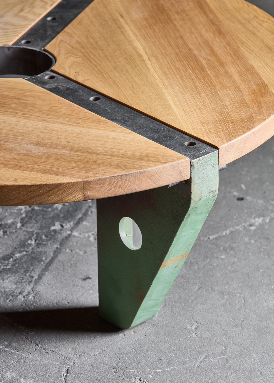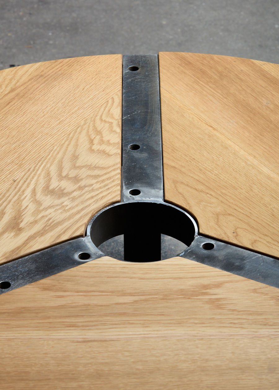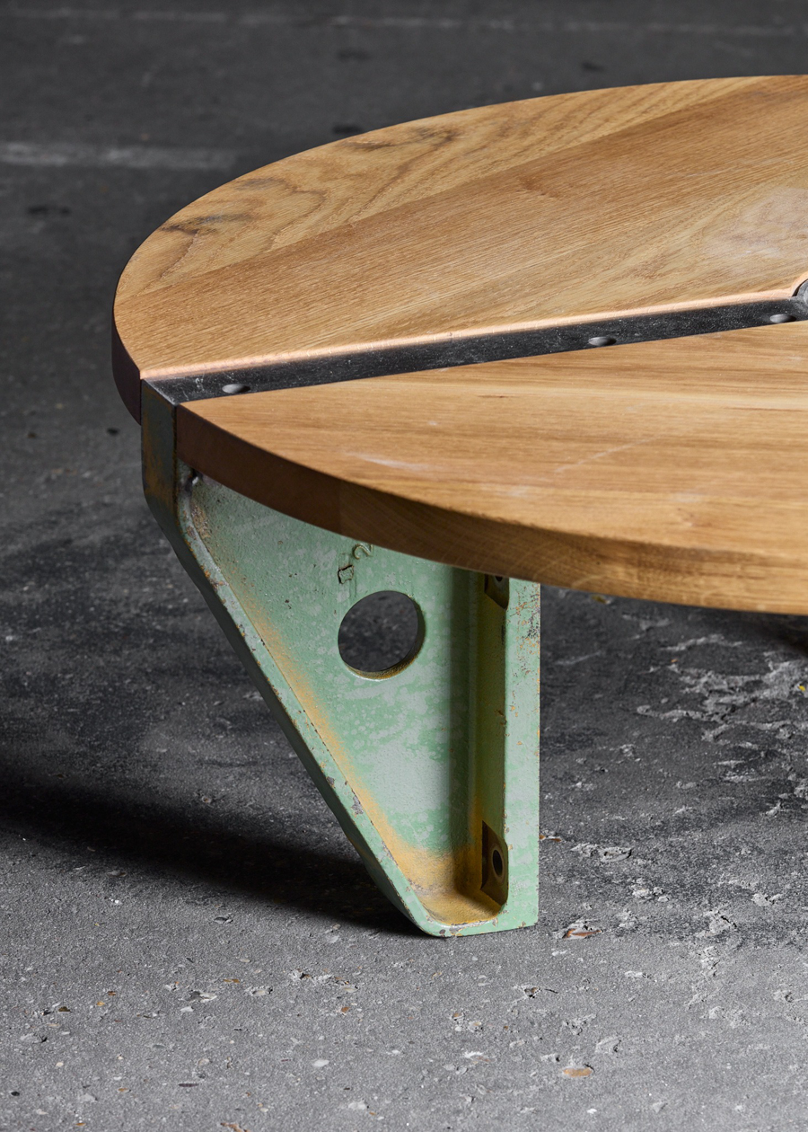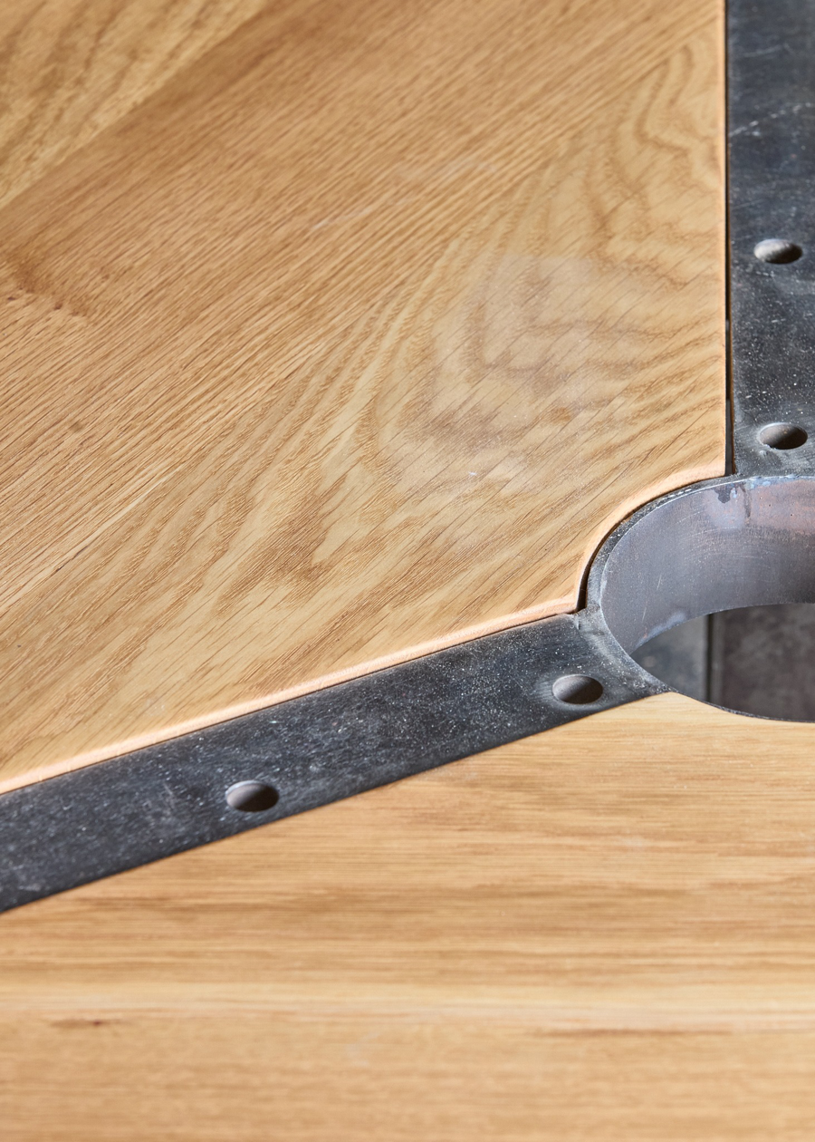 Uncertain steel pieces from SNCB, solid oak wood 86,5 x 33 cm