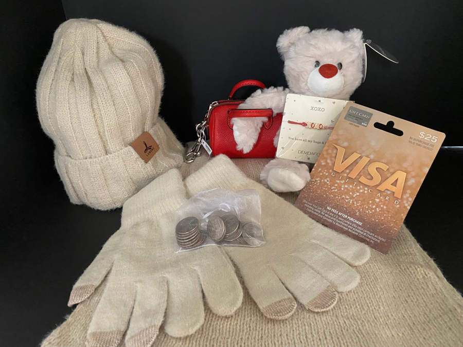$25 VISA Gift Certificate and Quarters in a Mini Coach plus winter white beanie, scarf and gloves to keep you warm on a winter day. Donor will ship item directly to winning bidder for free.