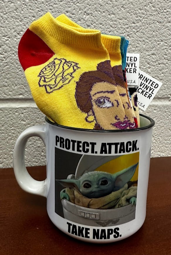 Mini Disney Basket 1 Baby Yoda mug, pack of Disney Princess socks, and assorted stickers