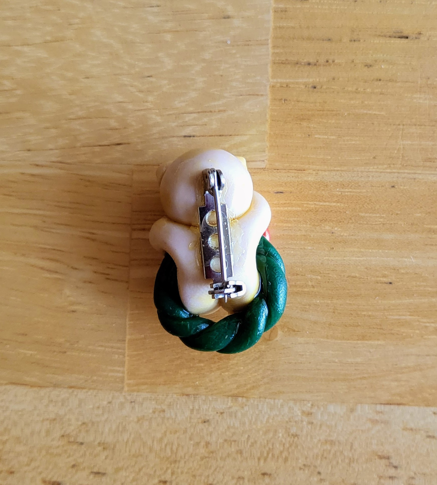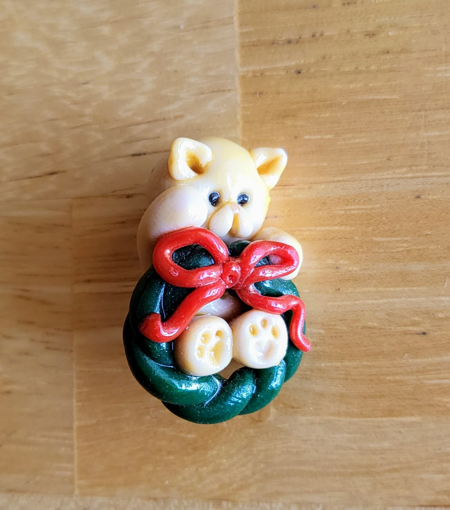 This tiny clay bear has wrapped himself in a ribboned wreath, and he wishes you the happiest of holidays! Measures approximately 1.25" x 0.75" and would be a fun stocking stuffer!