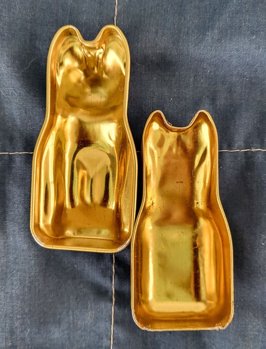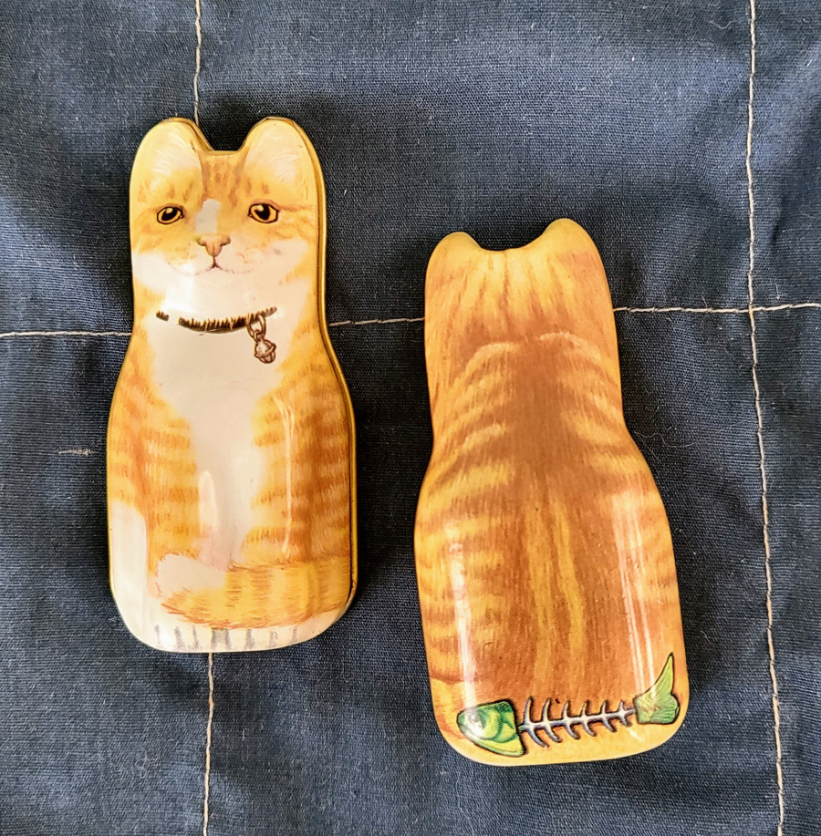 This tiny tin is PURRfect for storing little treats or trinkets. Fun painted fish skeleton on back (well, not fun for the fish!) Measures about 1" x 2.5"