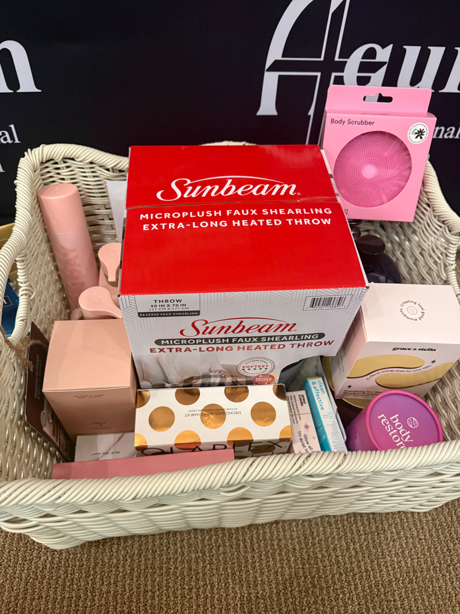Pamper Mom Basket: $40 Tips & Toes Gift Certificate, $50 Kim’s Nails Gift Certificate, JL Beauty & Wellness 60-Minute Massage Certificate, Heated Throw Blanket, Body Restore Shower Steamers, Baimei Jade Roller & Gua Sha, Grace & Stella Moisturizing Eye Roller and Energizing Eye Masks, Versed moisture cream, Salt & Stone Saffron & Cedar body lotion, Hempz Body Lotion, Boie Body Scrubber, Tula 24/7 Moisture Lip Mask, Monday Shampoo & Conditioner, Monday Hair Mask & Dry Shampoo, Olaplex Shampoo & Conditioner, Ghirardelli & Lindor Chocolates, Dr. Teals Foaming Bath Oil, & Threshold Candle.