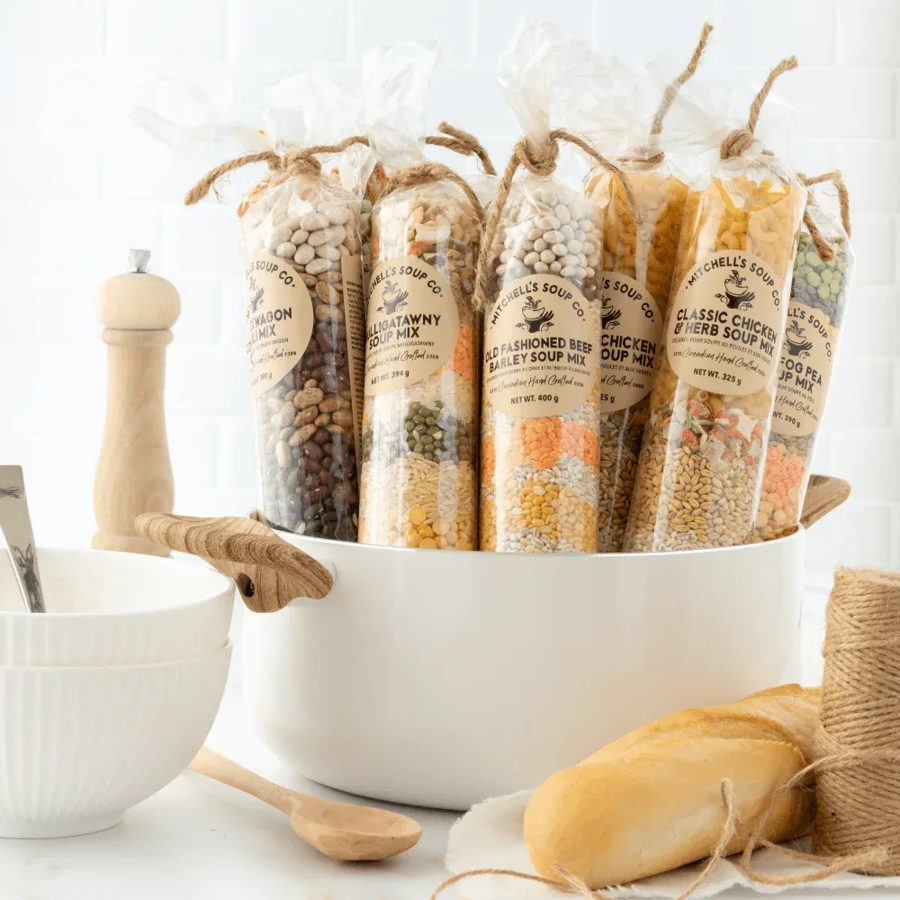 Experience the warmth and nostalgia of home with Mitchells' Soup Company’s collection of 6 soup mixes. Each hand crafted mix provides a delightful meal. With mouthwatering aromas that fill your kitchen and comfort in every spoonful, these time-honored recipes are lovingly crafted to remind you of home-cooked meals cherished and passed down through generations. Indulge in the comforting flavors and create new memories with these delicious soup mixes that celebrate the joy of family and tradition.