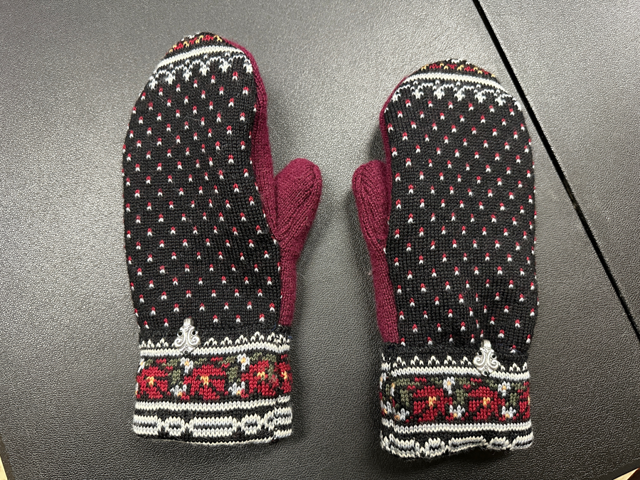Local seamstress Jane Prescott has created these mittens from upcycled materials. Adult size, and super warm.