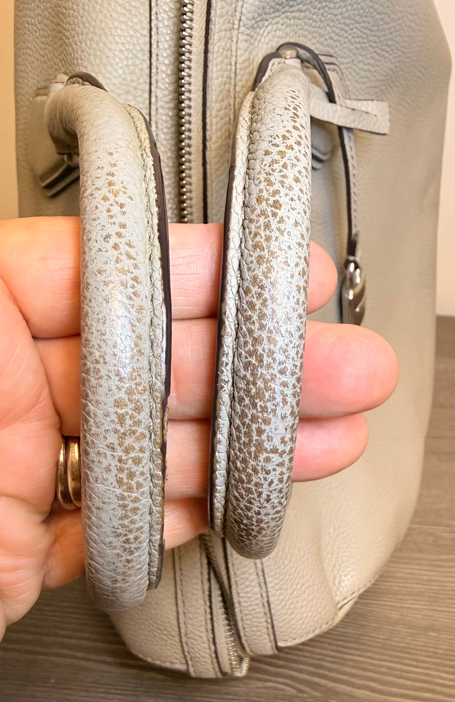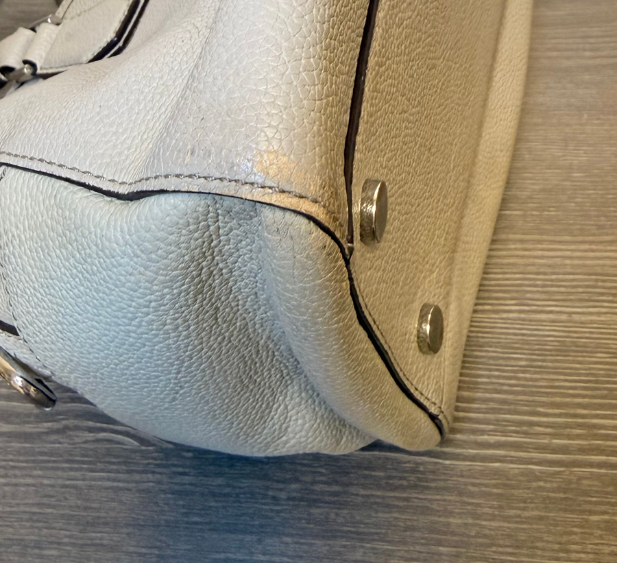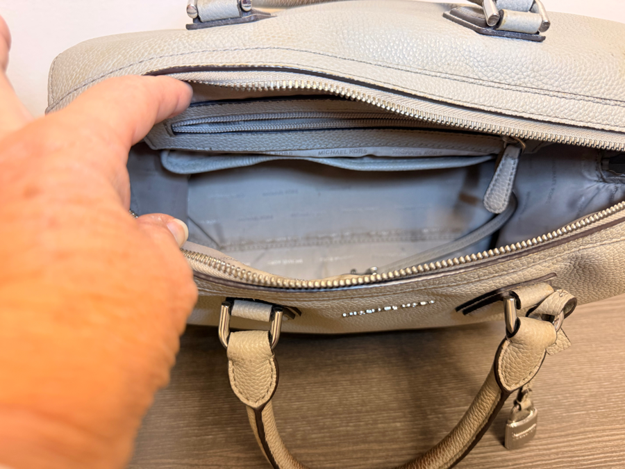 The MK Studio Mercier medium duffle is a popular handbag known for its versatile, structured silhouette, featuring dual rolled handles, zip-top closure, and convenient exterior magnetic snap pockets, plus interior slip and zip pockets for organization, offering a sophisticated yet functional carry-all for daily essentials. This bag is in a grey pebbled leather with silver toned hardware. It is missing the shoulder strap. The handles have some discoloration and bottom corners show some wear. Wrap a scarf around the handle and it will be a perfect coverup for the shown wear *see photos Color: grey Condition: Used Size: Measures approximately: 11"L x 9"H x 4.5"W, handle is 5.5inches