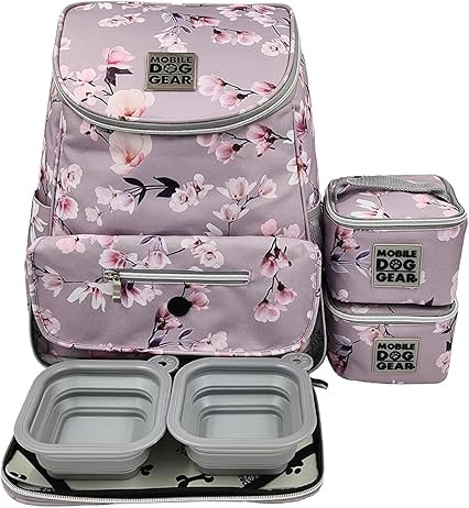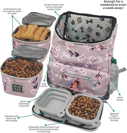 Spacious Design: Large storage capacity with multiple pockets to organize dog essentials effectively. Complete Feeding Solution: Includes 2 5-cup pet food storage containers and a placemat, featuring a patented zip-down feeding system for easy access and convenience. Durable Construction: Made from heavy-duty ripstop polyester, ensuring tear resistance and easy cleaning, ideal for rugged use during travels. Comprehensive Set: Includes 2 2-cup collapsible dog water bowls that are made of dishwasher safe silicone for easy cleaning and storage.