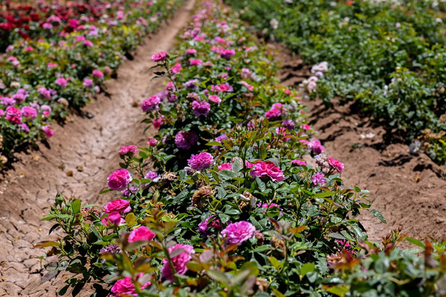 Floribunda Moco Muse is a captivating rose that enchants with its vivid magenta-pink blooms, perfectly sculpted in a classic, full-petaled form. Each flower seems to glow with depth and richness, catching the light to reveal delicate tonal variations across its velvety petals. The blooms unfold gracefully, revealing a harmonious balance of structure and softness, while the foliage provides a lush, green backdrop that enhances its radiant hue.