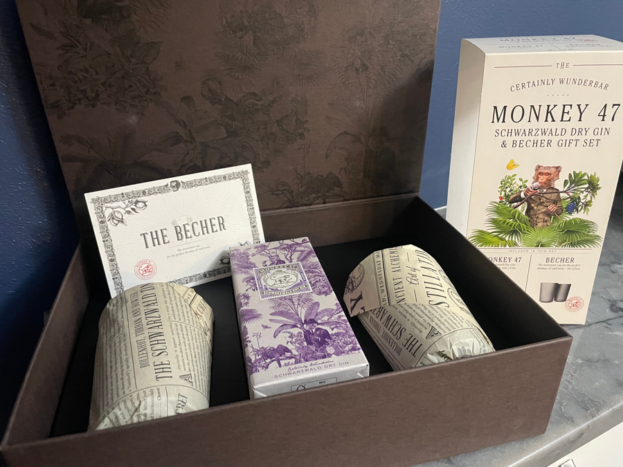 Monkey 47 Schwarzwald Dry Gin and glasses. Minimum $67 value!