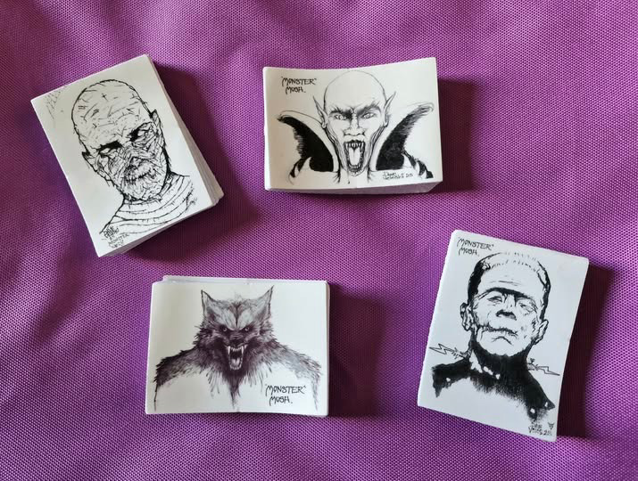 With custom artwork done by David Veleski, these four characters are dying to make your acquaintance! Each pack contains four stickers - Dracula, Mummy, Wolfman and Frank. Size - 7.5 cm x 5 cm $10 each - no need to bid, just choose 'buy it now' to get your pack!