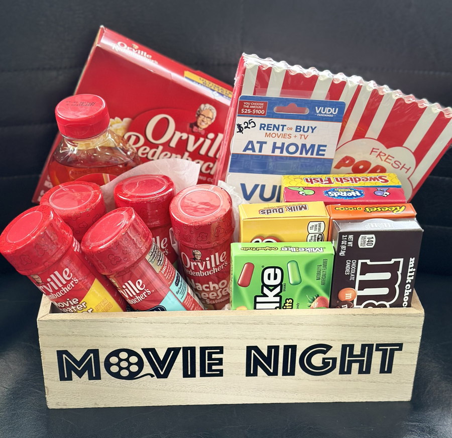 You're ready for movie night with all the essentials - popcorn, containers, toppings, "movie theatre" candy, and a $25 gift card to buy or rent movies at home!