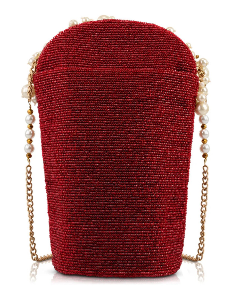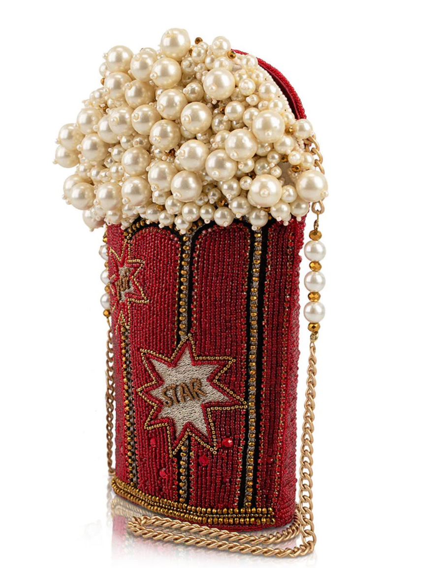 POP, SPARKLE, GLAM! THE MOVIE NIGHT PURSE & SANTIKOS GIFT CARD, IS SERVING RED CARPET REALNESS WITH A BUTTERY TWIST OVERFLOWING WITH PEARLY “POPCORN” AND RETRO CHARM, THIS BAG IS YOUR ULTIMATE SCENE-STEALER WHETHER YOUR’RE AT THE CINEMA OR JUST DRESSING LIKE THE STAR YOU ARE! WITH REMOVABLE BEADED CROSSBODY CHAIN STRAP, MAGNET CLOSURE, BACK SLIT POCKET, FITS A PHONE. COMES WITH PROTECTIVE STORAGE BAG & CERTIFICATE OF AUTHENTICITY. DIMENSIONS ARE APPROXIMATE.