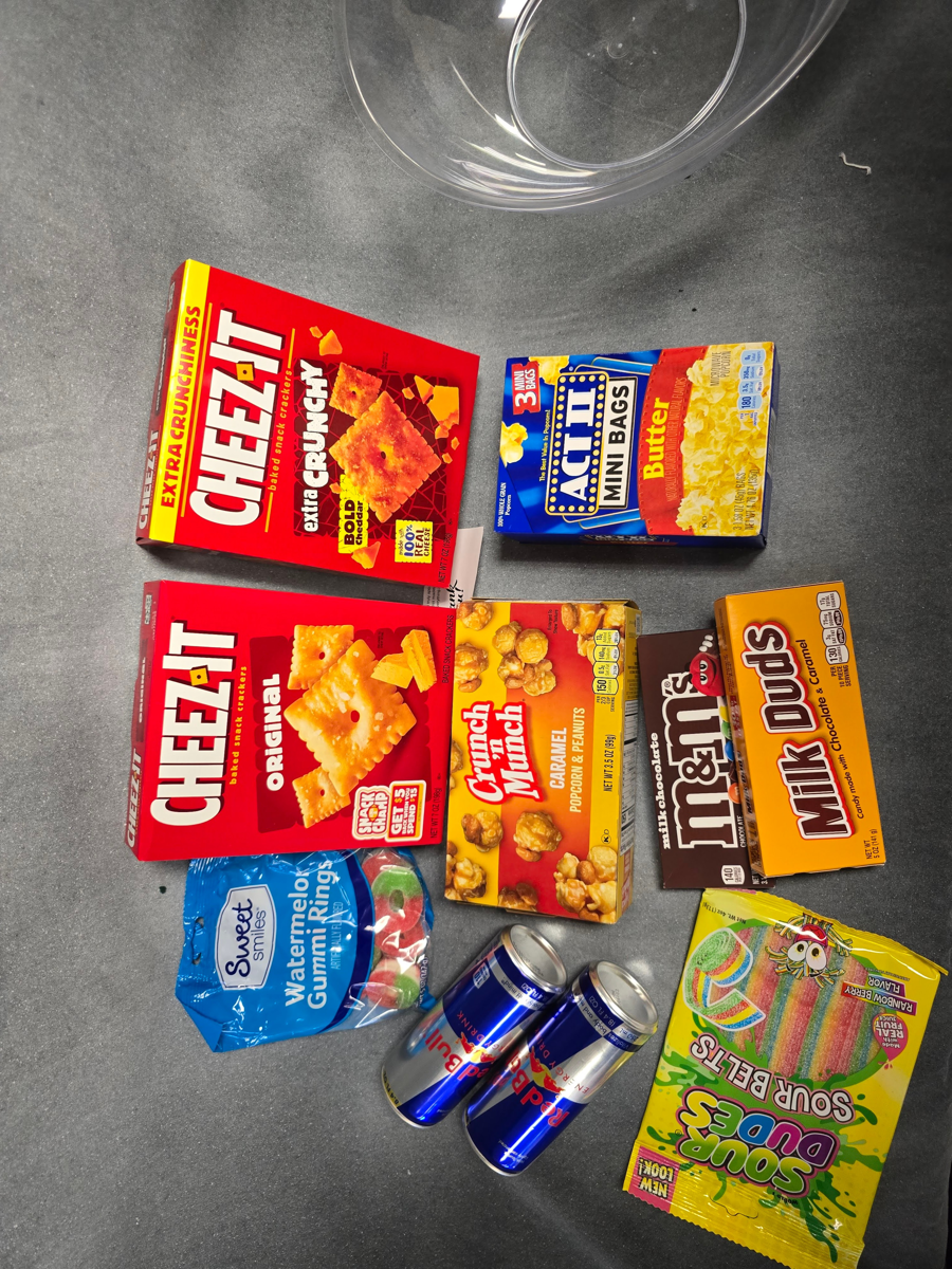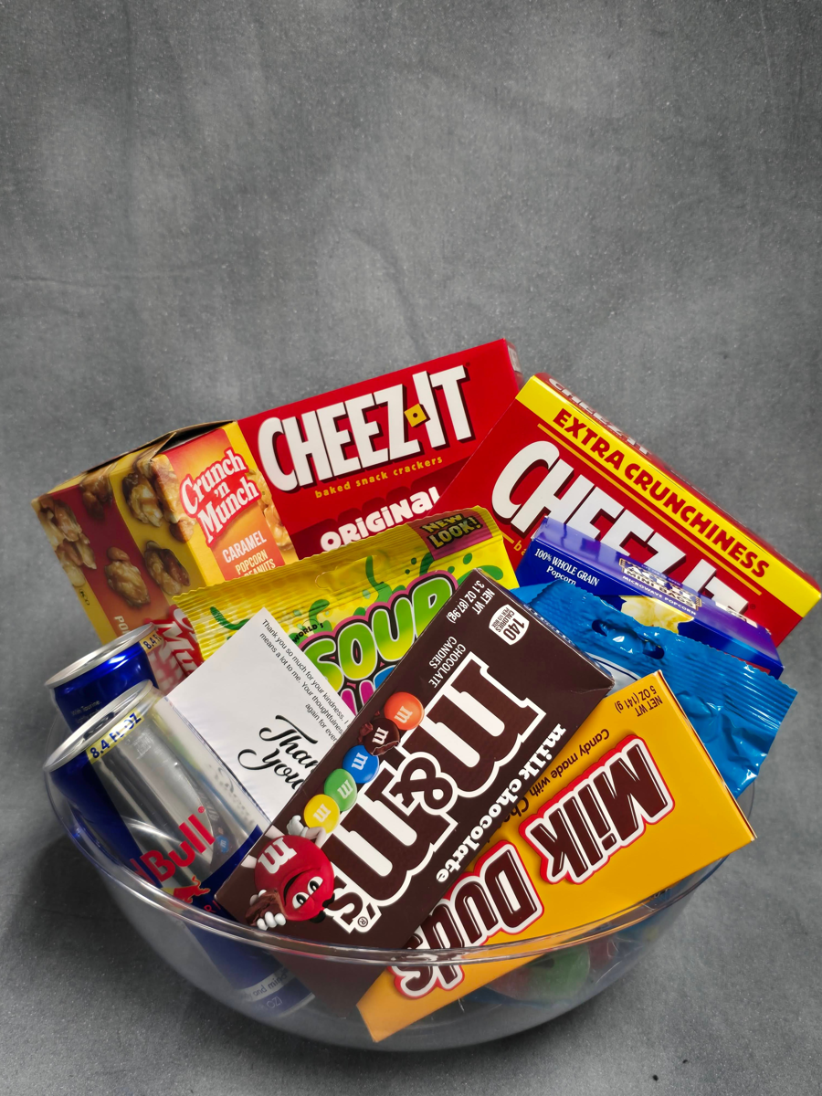It's time to treat yourself to a cozy movie night, complete with lots of snacks to enjoy. Bring your loved ones together and enjoy your favorite movies together. Basket includes: *2 Red Bulls *2 Cheez its *M&Ms *Milk Duds *Act 11 Mini bags popcorn *Crunch n' Munch Carmel Popcorn & Peanuts *Sour Dudes *Watermelon Gummies Basket Artist: Nada Ahmed