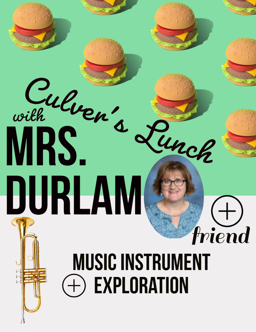 One lucky winner and a friend will enjoy a delicious lunch at Culver's with Mrs. Durlam. After lunch, the fun continues as you explore a music instrument with Mrs. Durlam, who will share her passion for music and teaching. This unique experience combines great food and the joy of learning, making it a perfect day out. Don’t miss your chance to create wonderful memories while discovering the world of music!