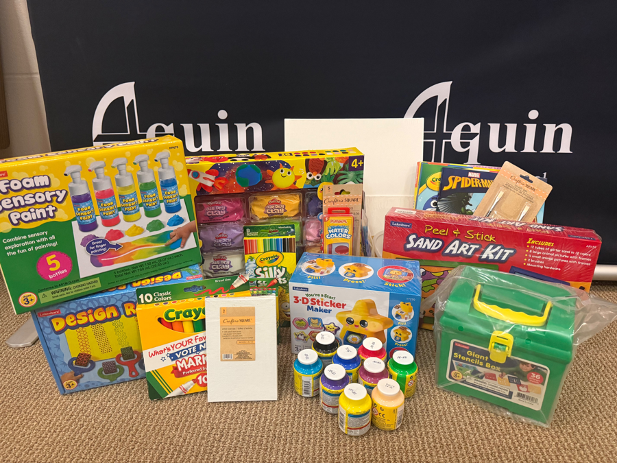Arts & Crafts Basket: Coloring books, markers, paint sets, paint brushes, sticker maker, foam sensory paints, stencils, sand art kit, air dry clay kit and Play-Doh Sizzlin Grill Playset.