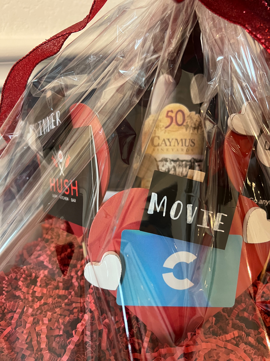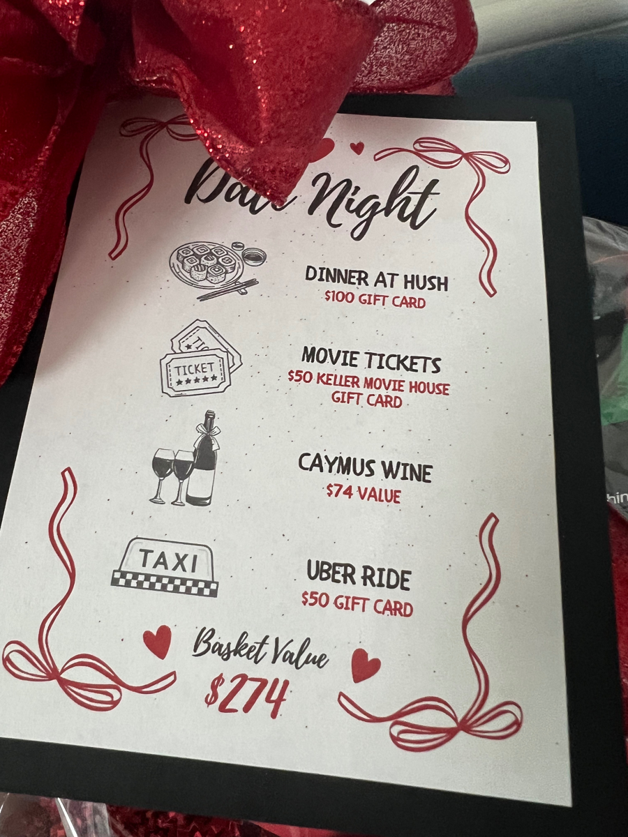 Mrs. Hetherington | Date Night Basket Enjoy dinner and a movie with a safe ride, plus a nice bottle of wine! Items/Value: 2022 Caymus Cabernet Sauvignon 750 ml $74; HUSH gift card $100; Keller Movie House gift card $50; Uber gift card $50. Basket Value $274