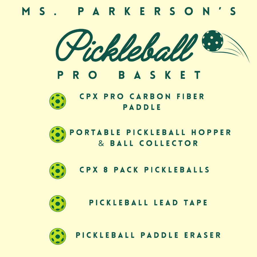 Mrs. Parkerson | Pickleball Pro Items/Value: CPX Carbon Fiber Paddle $100; Ball Retriever / Carrier Basket $100; CPX 8 Pack of Pickleballs $25; Augment Pickleball Lead Tape $12; Pickleball Paddle Eraser $10 Basket Value $247