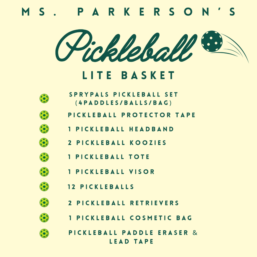 Mrs. Parkerson | Pickleball Lite Items/Value: 4 Sprypals Pickleball paddles & balls $40; Pickleball Headband $3; Pickleball cosmetic case $7; Augment Pickleball Lead Tape $12; Pickleball Paddle Eraser $10; Pickleball Ball Retriever $5; (2) packs of Pickel O'Joe 6 pack pickleballs $20; Pickleball Canvas tote $7; Pickleball Visor $5; Pickleball koozies $5; Pickleball Protector Tape $7. Basket Value $121