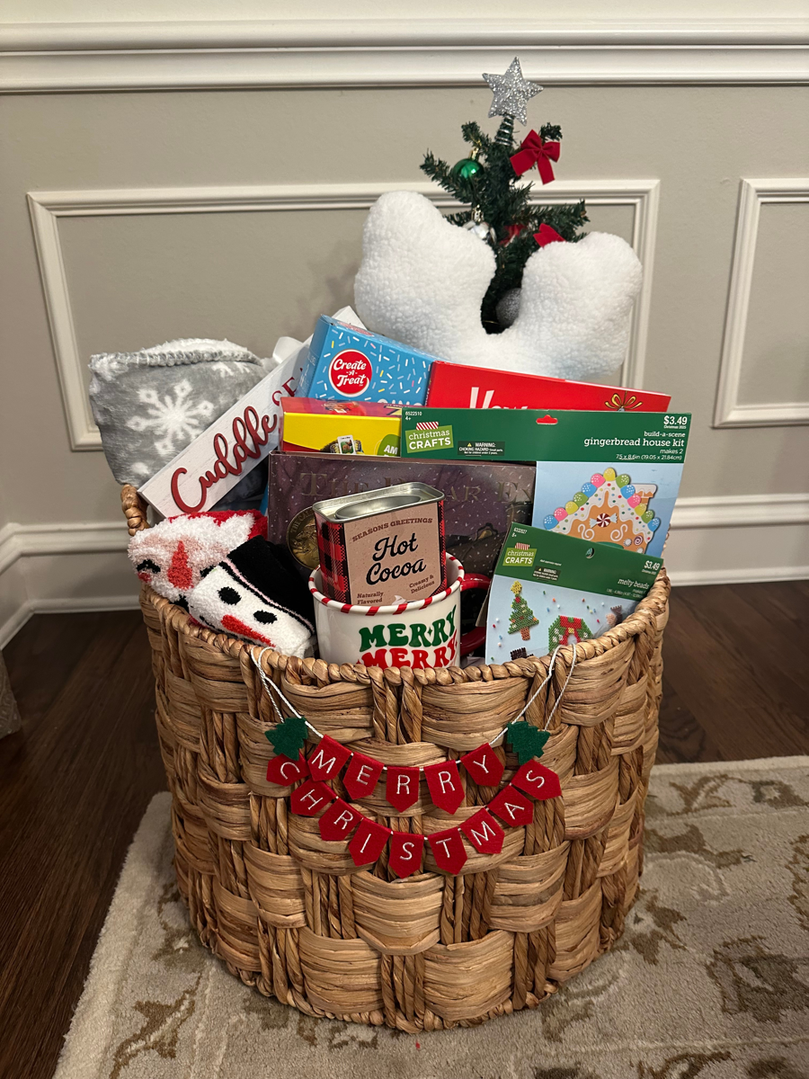 Mrs. Rice | Have Yourself a Cozy Little Christmas Items/Value: Gingerbread Houses $7.50; Hot Chocolate Mix $3.50; (2) Hot Chocolate Mugs $9.00; (2) Crafts $3.50; (2) Pairs of Fuzzy Socks $4.00; Seasonal Sign $1.50; Snowflake Pillow $11;Snowflake Blanket $10; Decorated Accent Christmas Tree $14; "How the Grinch Stole Christmas" Book $11.50; "The Polar Express" Book $15; Headbanz Game $16; Braided Basket $18. Basket Value $124.50