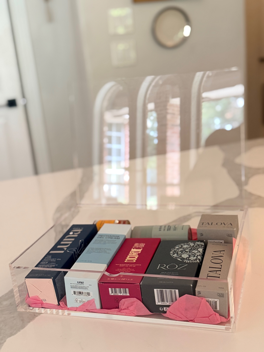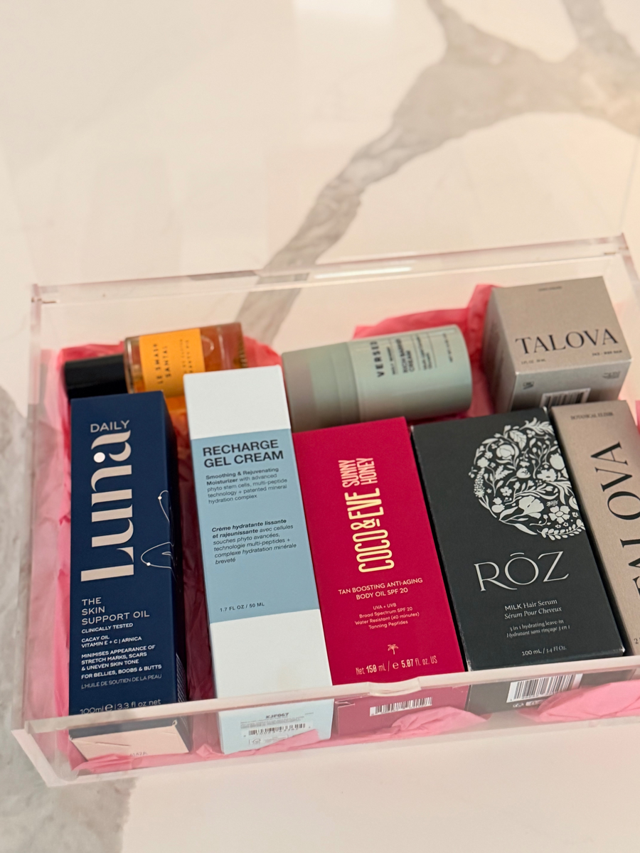 Mrs. Styne | Self Care #3 Beauty & Skincare Items/Value: Luna Skin Support Oil $46; Beauty Pie Le Smash Santal Perfume $116; Versed Rich Barrier Cream $21; Talova Body Balm $57; Talova Botanical Elixir $84; Roz Milk Hair Serum $29; Coco and Eve Tan Boosting Body Oil $36; InBeauty Recharge Gel Cream $48. Basket Value $437