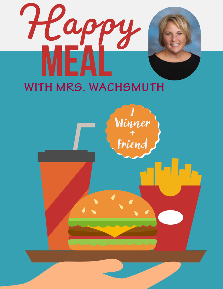 Join Mrs. Wachsmuth for a delightful Happy Meal Lunch experience! Share stories, laughter, and great food as you spend quality time with Mrs. Wachsmuth, who brings her passion for teaching and joy for learning to the table. Don't miss out on this chance to create lasting memories with a favorite educator while enjoying a tasty Happy Meal!