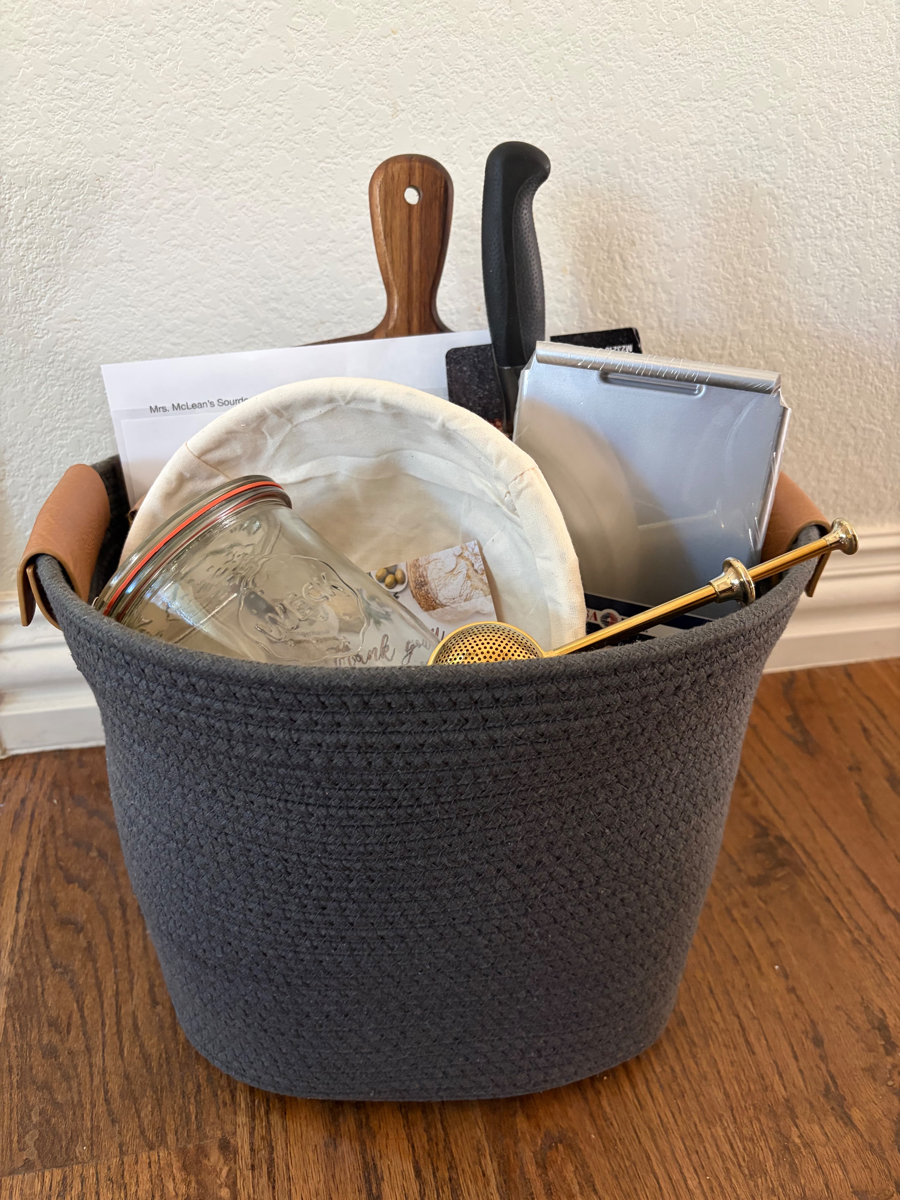 Ms. McClean | Sourdough Items/Value: Pack of two Weck Tulip Jars (1 Liter) $24.98; Mercer Culinary 10-inch wide wavy edge bread knife $15.96; Acacia wood cutting board (17”x13”) $26.98; Handcrafted Bread Lame – Sourdough scoring tool $8.99; Pullman Loaf Pan with cover 13x4 inch $38.99; Powdered sugar shaker/Duster flour dispenser shaker $8.99; Round bread banneton basket with liner - 9 inch $9.99; Silicone dough scraper $5.56; ThermoPro waterproof Thermometer $16.98; Digital Kitchen Scale $9.99; Sourdough Recipes & Sourdough Starter from Sarah Page included. Basket Value $167.71 If you win, contact Sarah Page to coordinate starter: 214-808-4041 If you won, contact Sarah Page to coordinate starter: 214-808-4041