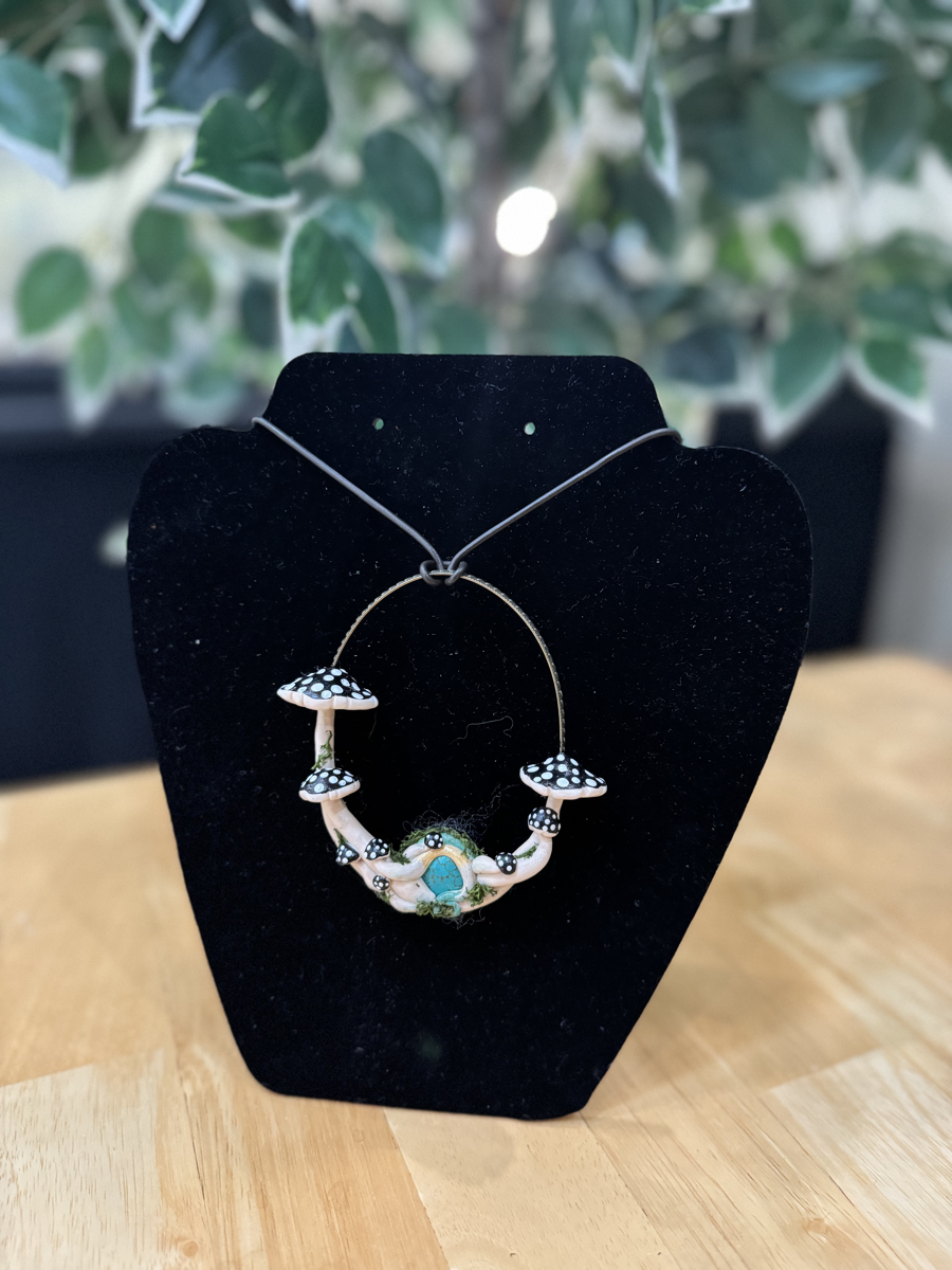 Medium: Modeling clay, paint, turquoise, moss, metal oval, on necklace cord