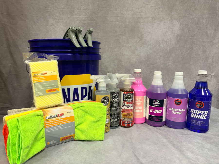 Great car care kit. Includes 8 PK Gear Up Microfiber Towels, 1 Bug Scrub Sponge, Super Shine Wash, Hawaiian Shine, D-Bug, Superior Shield, Leather Cleaner, 2 Chemical Guys Air Freshener Sprays, and a Napa bucket for storage.