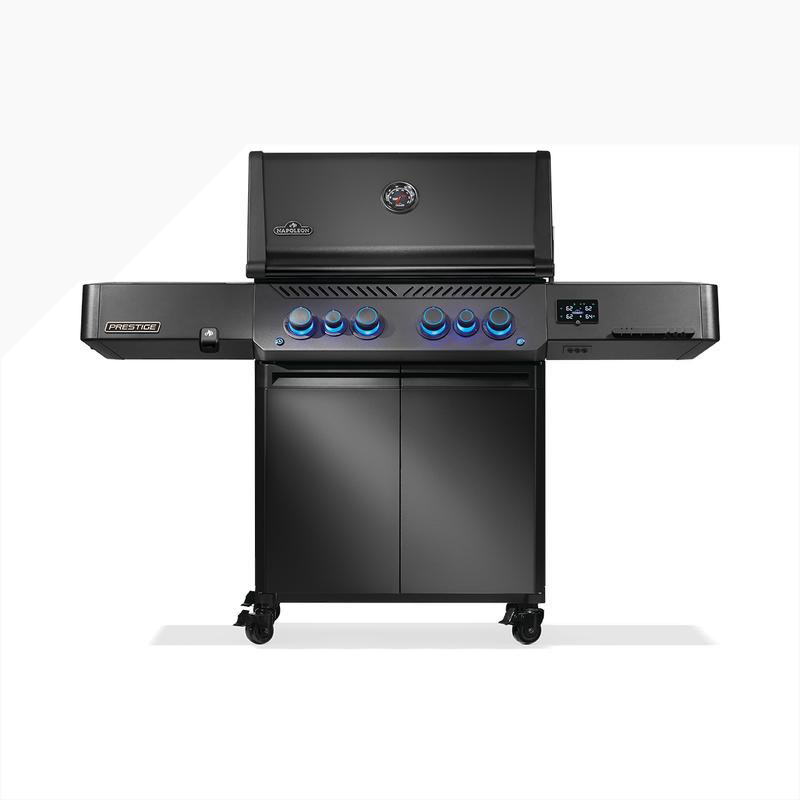 The Napoleon Phantom Prestige 500 Connected Gas Grill features sleek matte-black styling and smart grilling technology, including Wi-Fi and Bluetooth connectivity to monitor temperatures, set timers, and receive alerts from your phone. It also includes infrared side and rear burners, a rotisserie system, LED safety-glow control knobs, and generous cooking space for high-performance grilling.