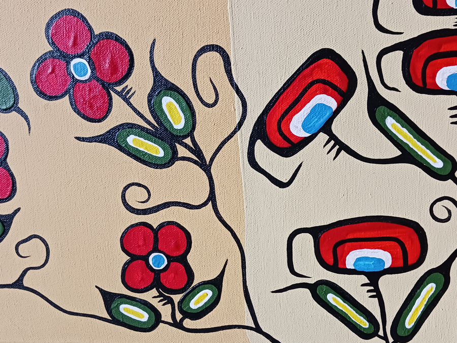 This painting, although unsigned, is an original by Brian Marion. He painted it during his most difficult times, and it was given to us by one of his good friends. Marion was born on October 6, 1960, in Kamsack, Saskatchewan, growing up amongst the Saulteaux and Cree of the Prairies and the Ojibway of the Northern Woodland of Ontario. In 1975, Brian began a nine-year apprenticeship with Norval Morrisseau, the internationally renowned Canadian Native Artist and founder of the Woodland School of Art. He suffered from alcoholism and depression and sadly passed away in 2011. Size 10" x 20" on canvas.