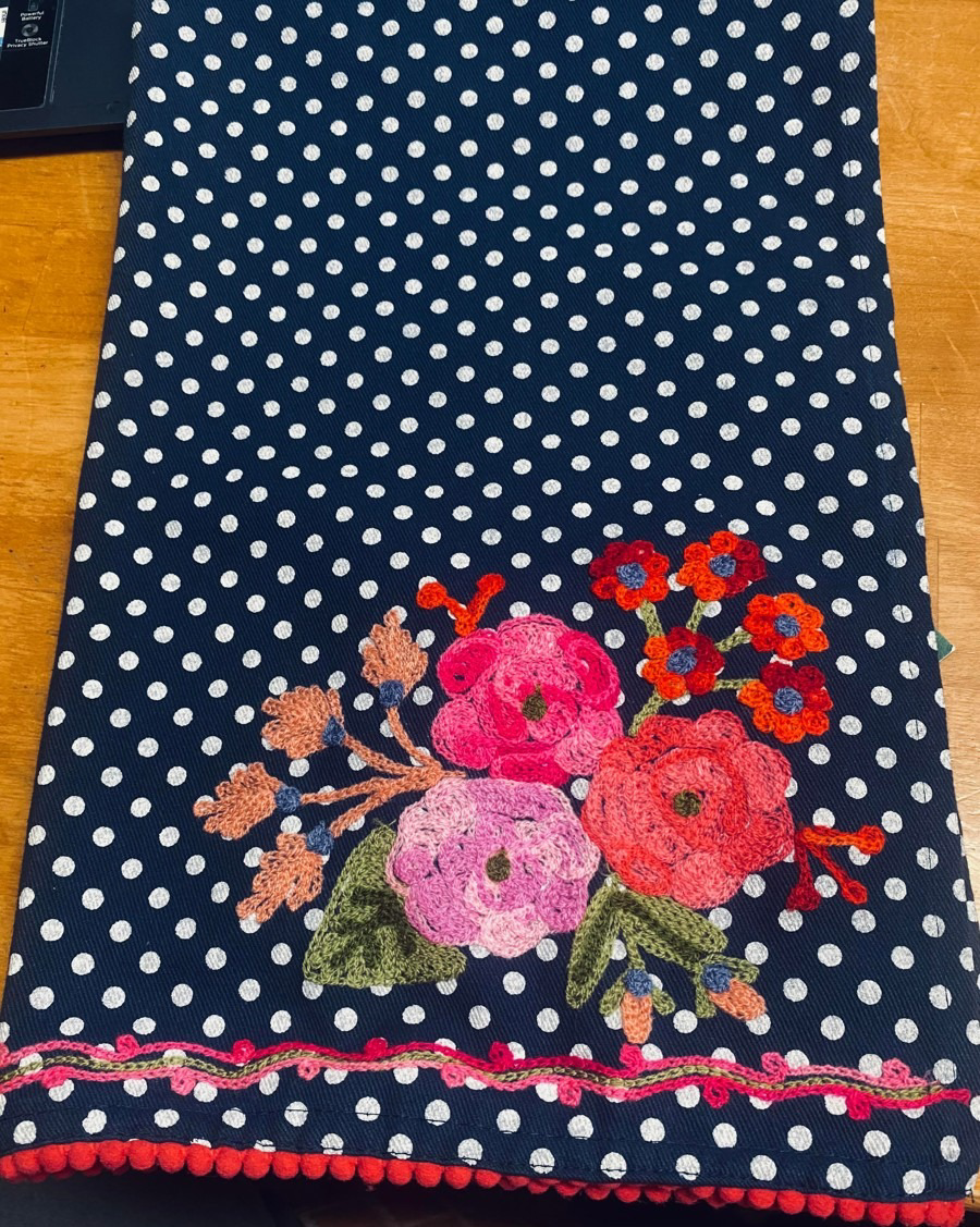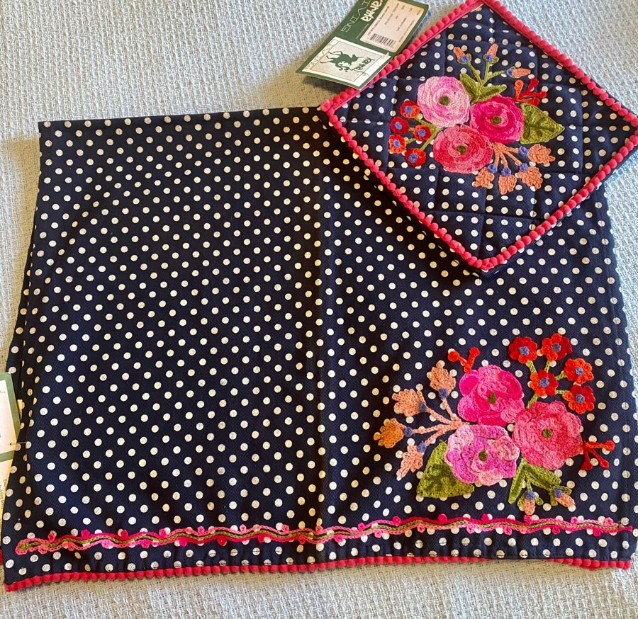Navy w White Polka Dots & Embroidered Tea Towel & Pot Holder. Match #175