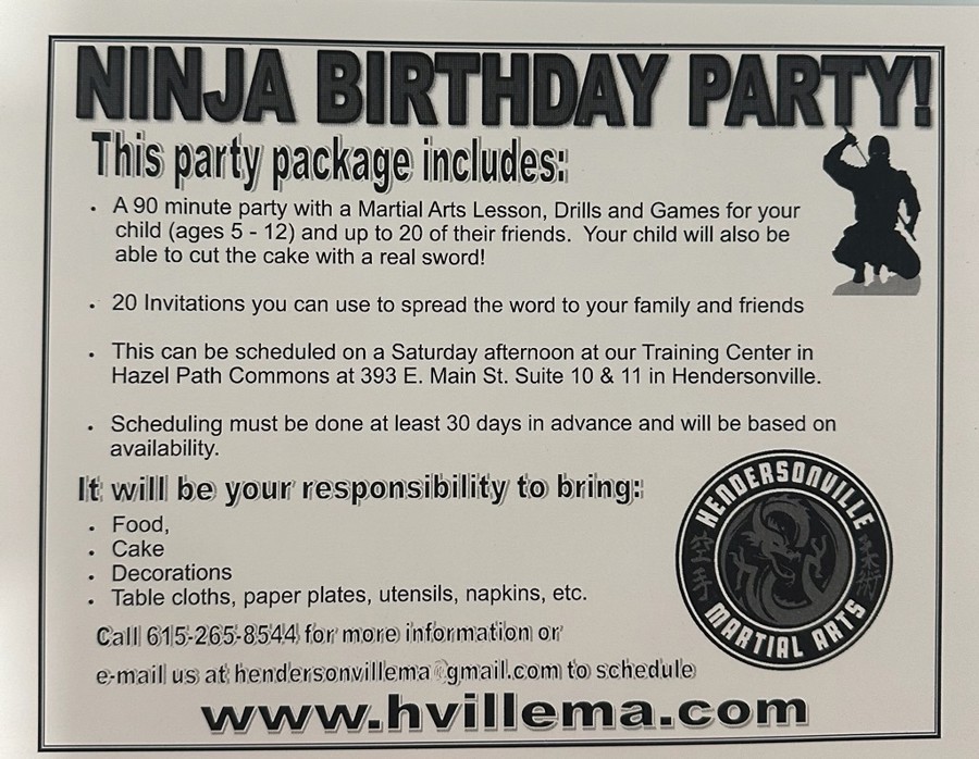 90-minute party with a Martial Arts lesson, drills and games for your child (ages 5-12) and up to 20 of their friends. Your child will get to cut their cake with a real sword! Hosted by Hendersonville Martial Arts at their Training Center in Hazel Path Commons (393 E Main St, Suite 10 & 11)