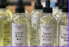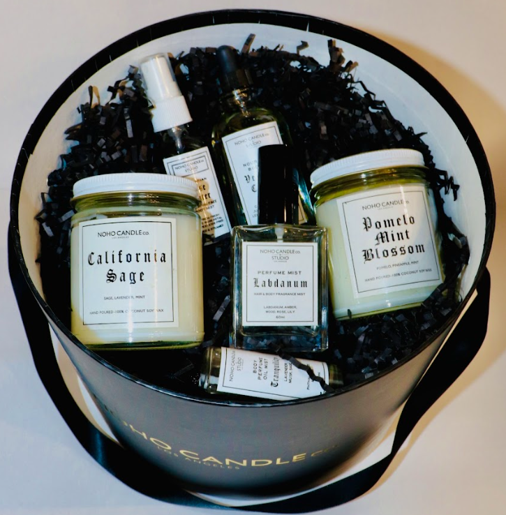 Additional details: Rose Water Hydrating Face and Body Mist 2 oz., Nourishing Body Oil Verbena Citron 4 oz (Calabrian lemon, juniper, green lilac, lemon verbena, citron), 8 Oz Pomelo Mint Blossom Candle (Pomelo, pineapple, mint: 50 hr burn time), 8 oz. California Sage candle (Sage, lavendar, mint: 50 hr burn time), Labdanum Perfume Mist 60ml (Labdanum, amber, wood, rose, lily) and Tranquility Body Perfume Oil Mist 60 ml (Lavendar, musk, sage) in a beautiful NoHo Candle Co. flower box